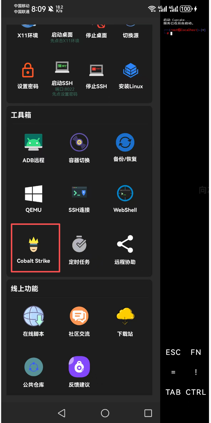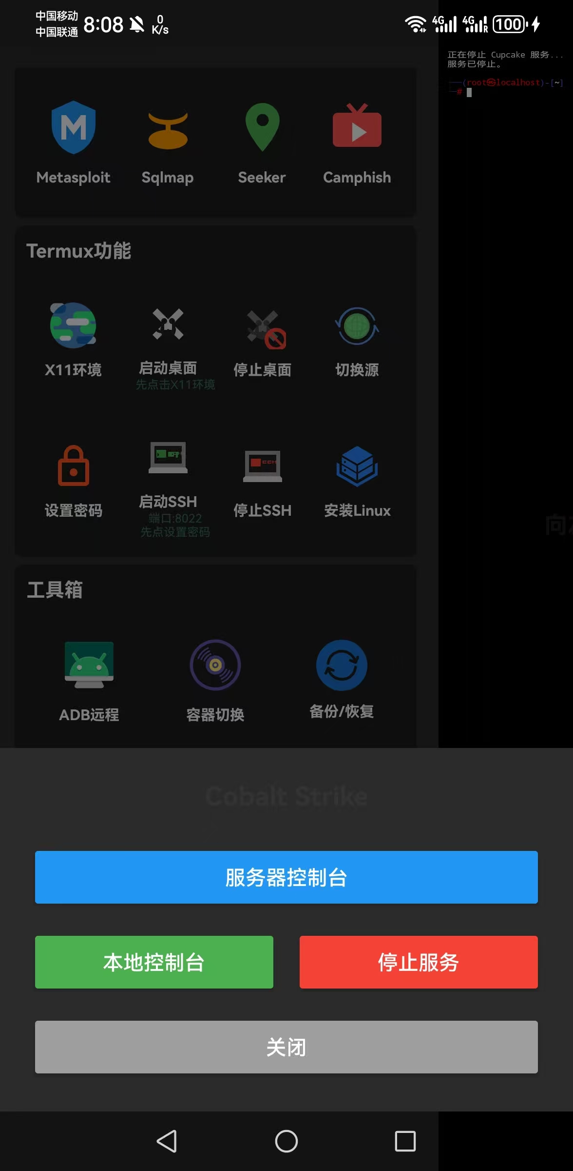 - 在 Termux-X 中点击 Cobalt Strike -> 服务器控制台。