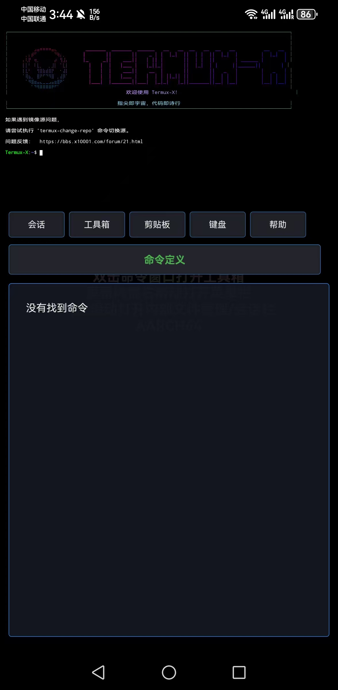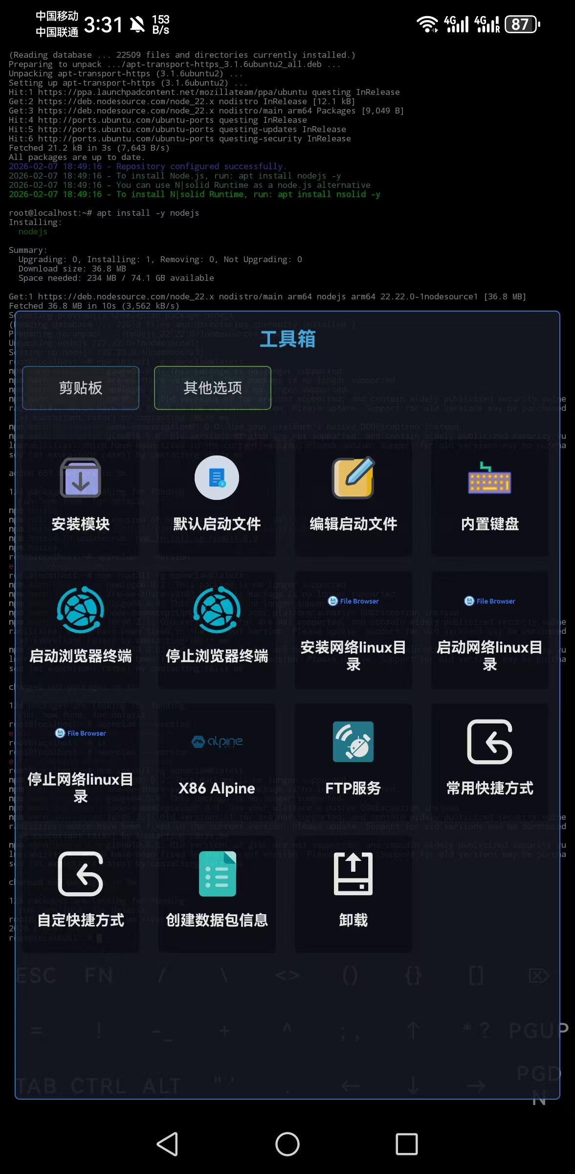在 Termux-X 终端界面双击屏幕,即可呼出强大的工具箱菜单。该功能旨在提供便捷的快捷操作、系统管理和网络服务入口。