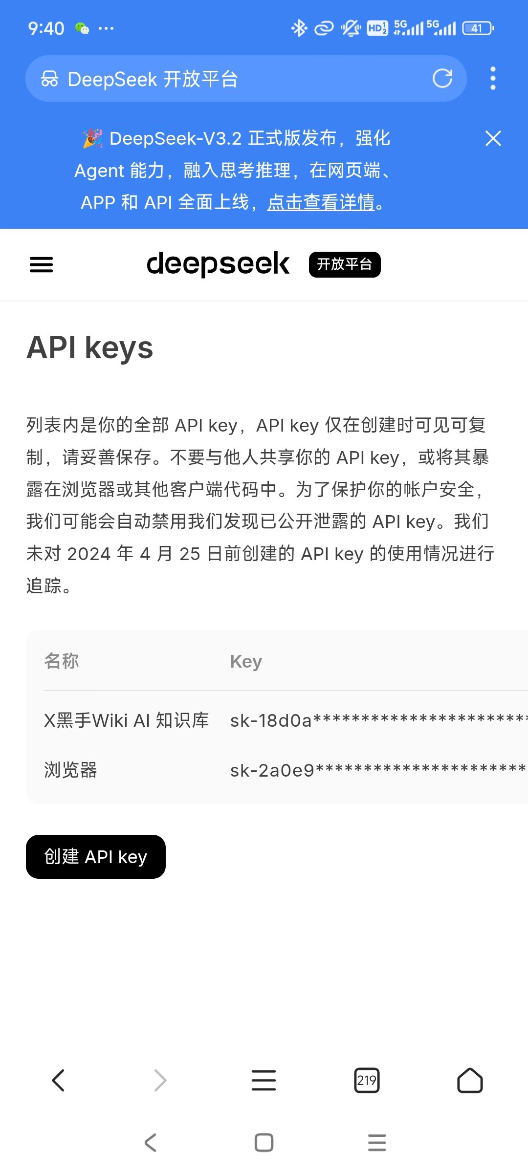 - 点击 "Create API Key" 创建一个新的密钥。