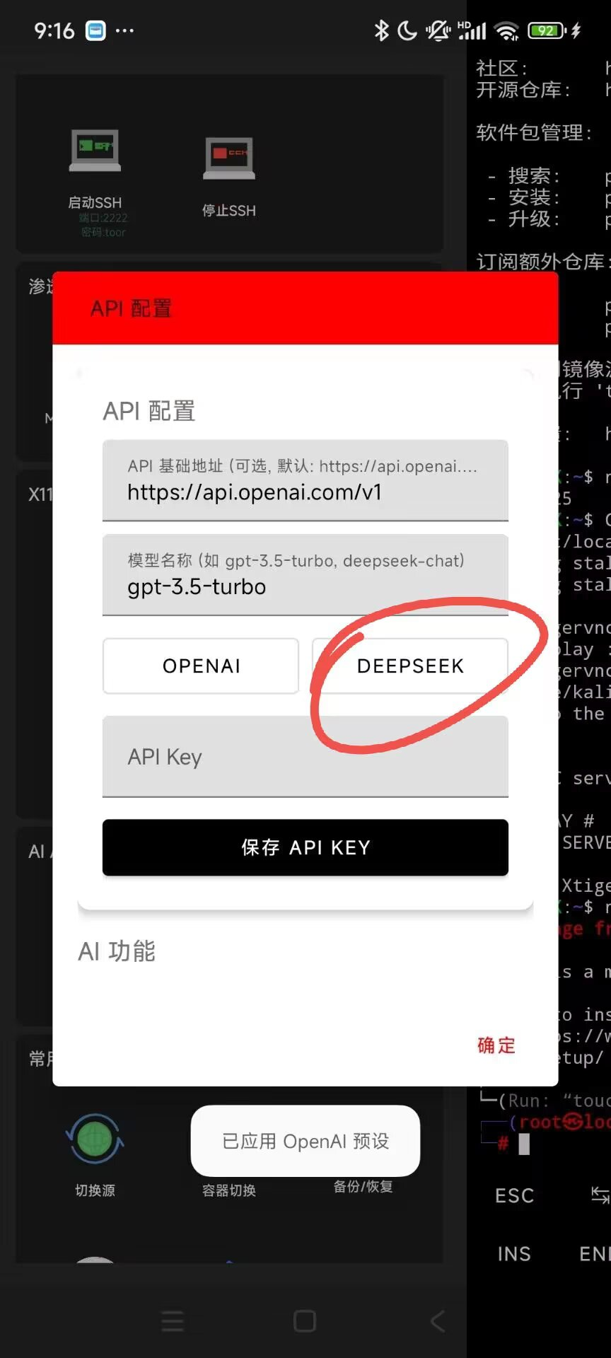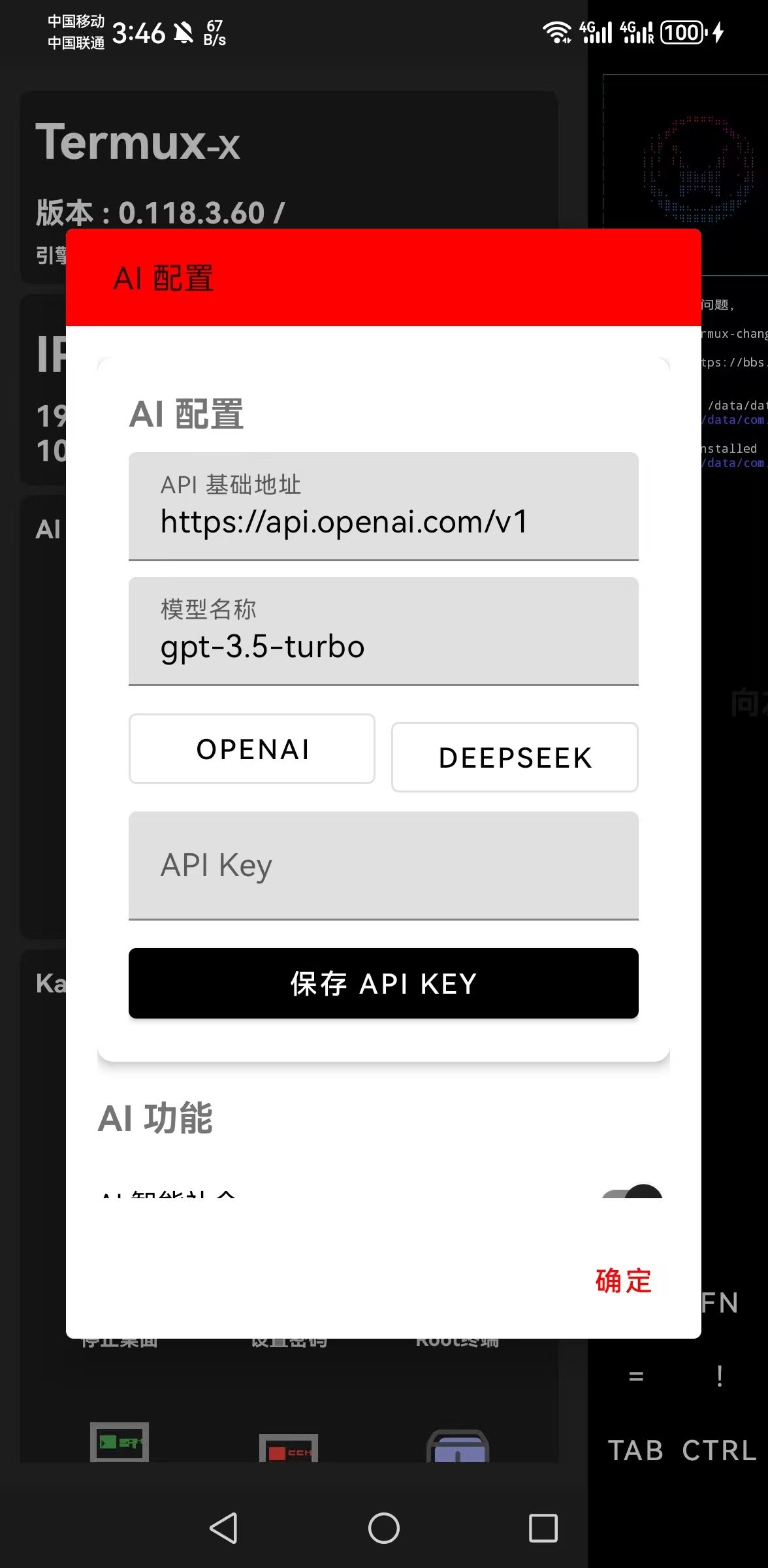 - 在 Termux-X 的 AI 配置 面板中,点击底部的 "DeepSeek" 预设按钮。