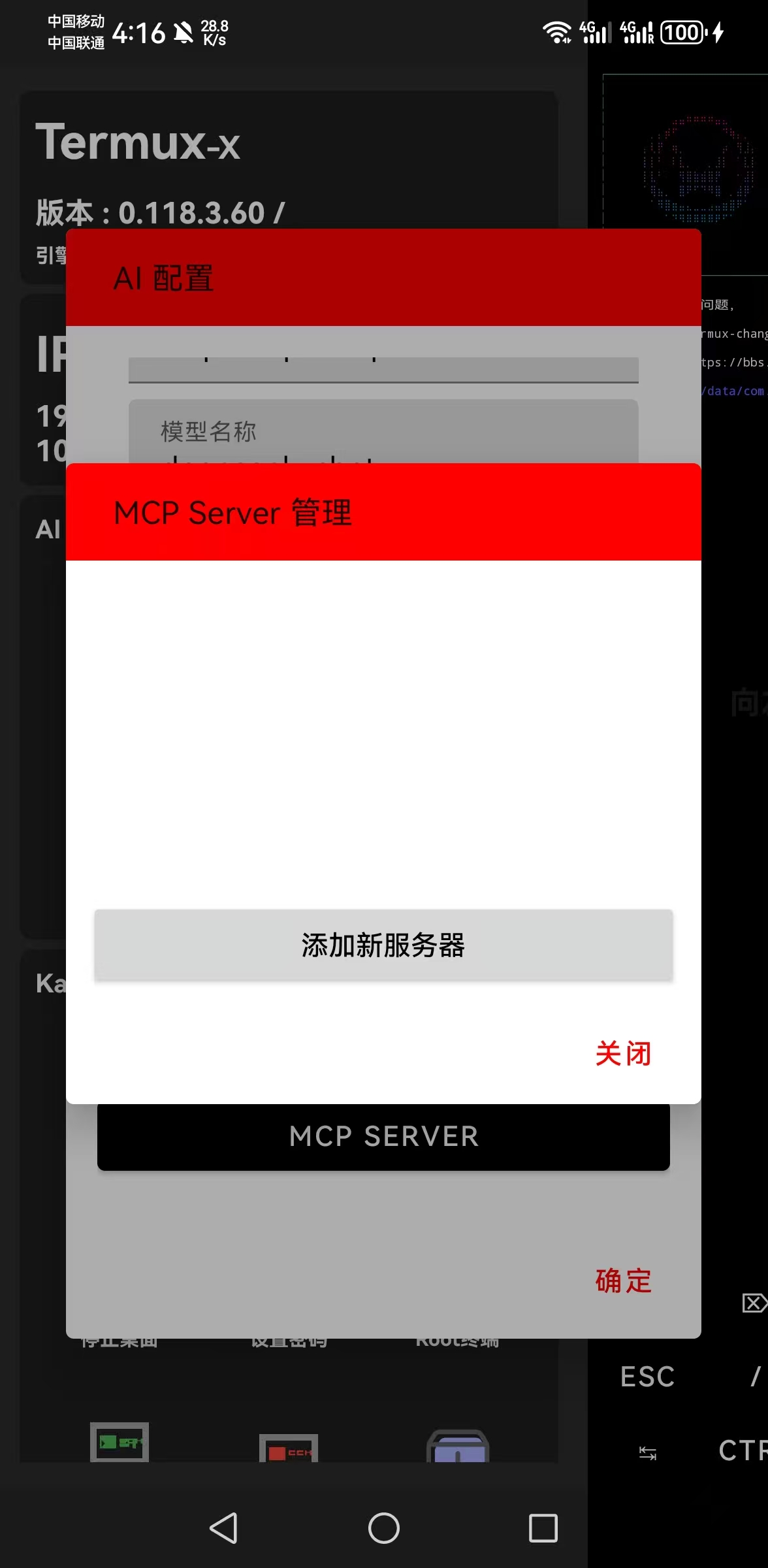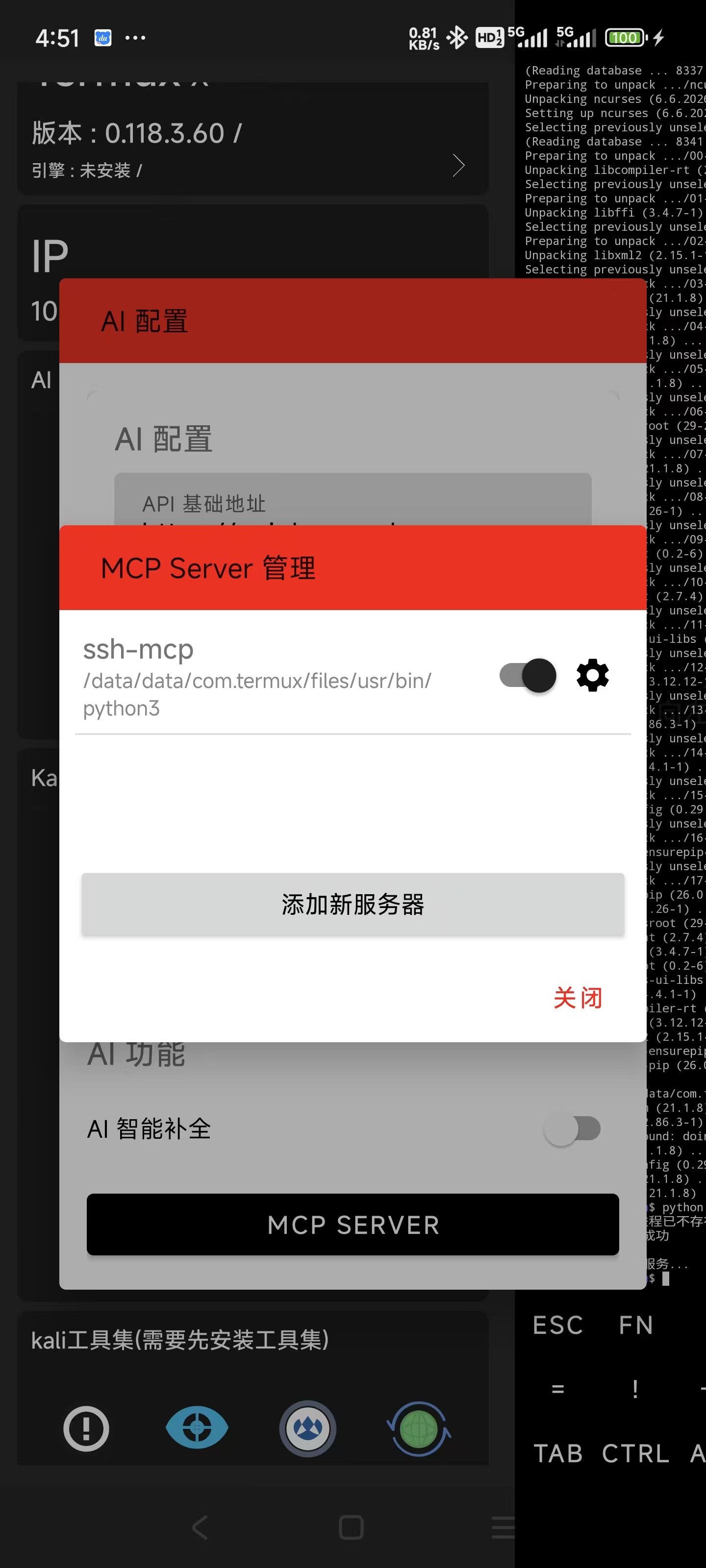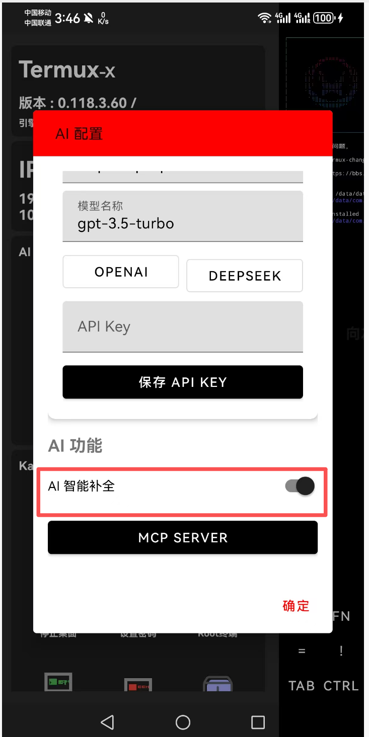 Termux-X 内置了强大的 AI 助手,支持 OpenAI、DeepSeek 等兼容接口的模型。通过配置 API,您可以让 AI 辅助您编写代码、生成命令、甚至通过 MCP 协议操作终端。