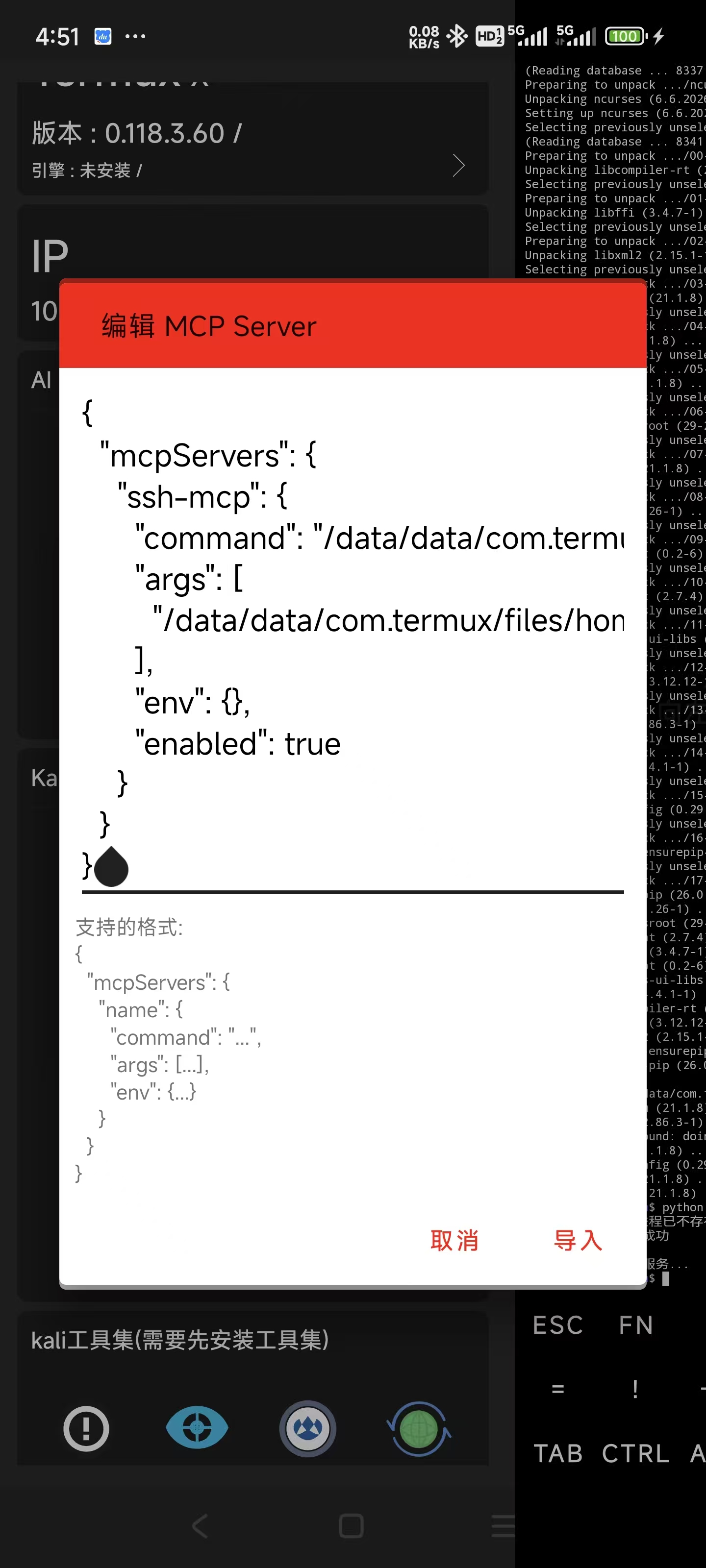json{ "mcpServers": { "ssh-mcp": { "command": "node", "args": [ "/data/data/com.termux/files/home/mcp-ssh/dist/index.js" ] } } }注意: