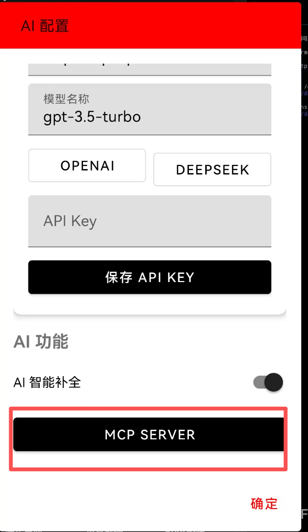 在 AI 配置 面板中,点击底部的 "MCP SERVER" 按钮。