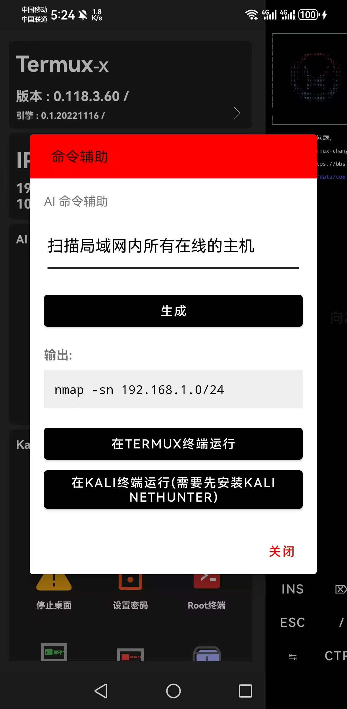 rm) 或系统修改的危险命令前,请务必人工核对一遍。 - Root 权限:如果您选择 "Run Kali",请确保您的设备已获取 Root 权限并正确安装了 Kali NetHunter 环境。