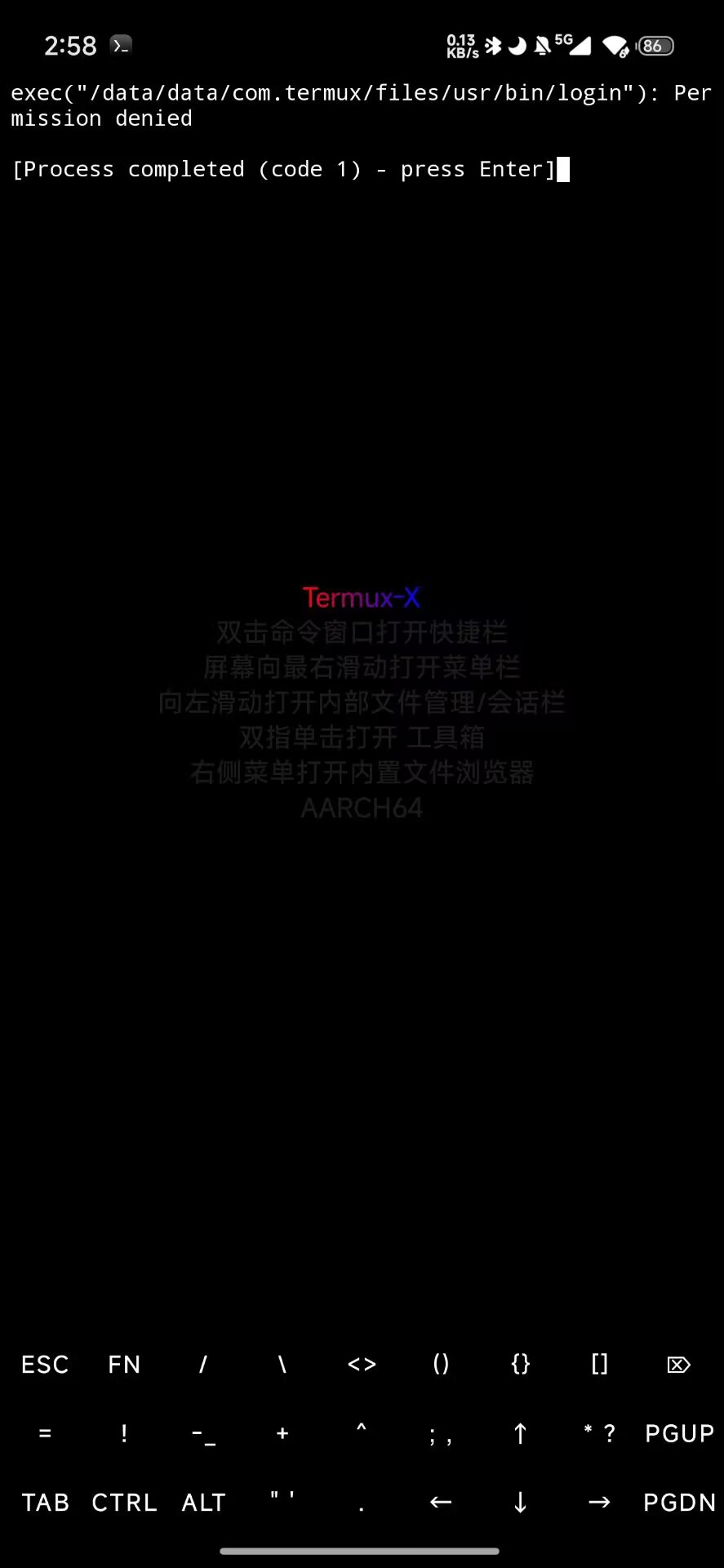 现象描述: 终端启动后显示 exec("/data/data/com.termux/files/usr/bin/login"): Permission denied,随后提示 [Process completed (code 1) - press Enter]。