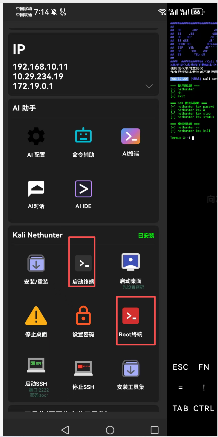 安装完成后,您可以通过 侧边栏快捷按钮 (推荐) 或 终端命令 两种方式来使用 Kali NetHunter。