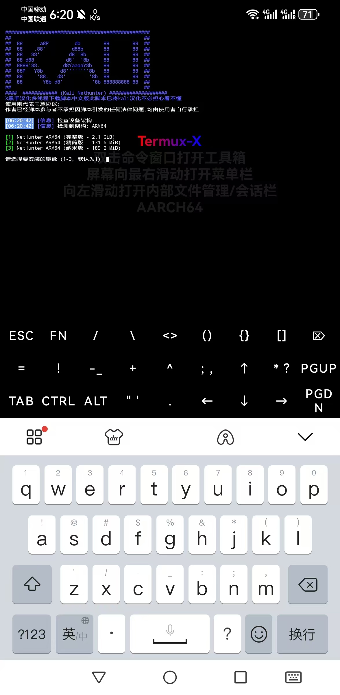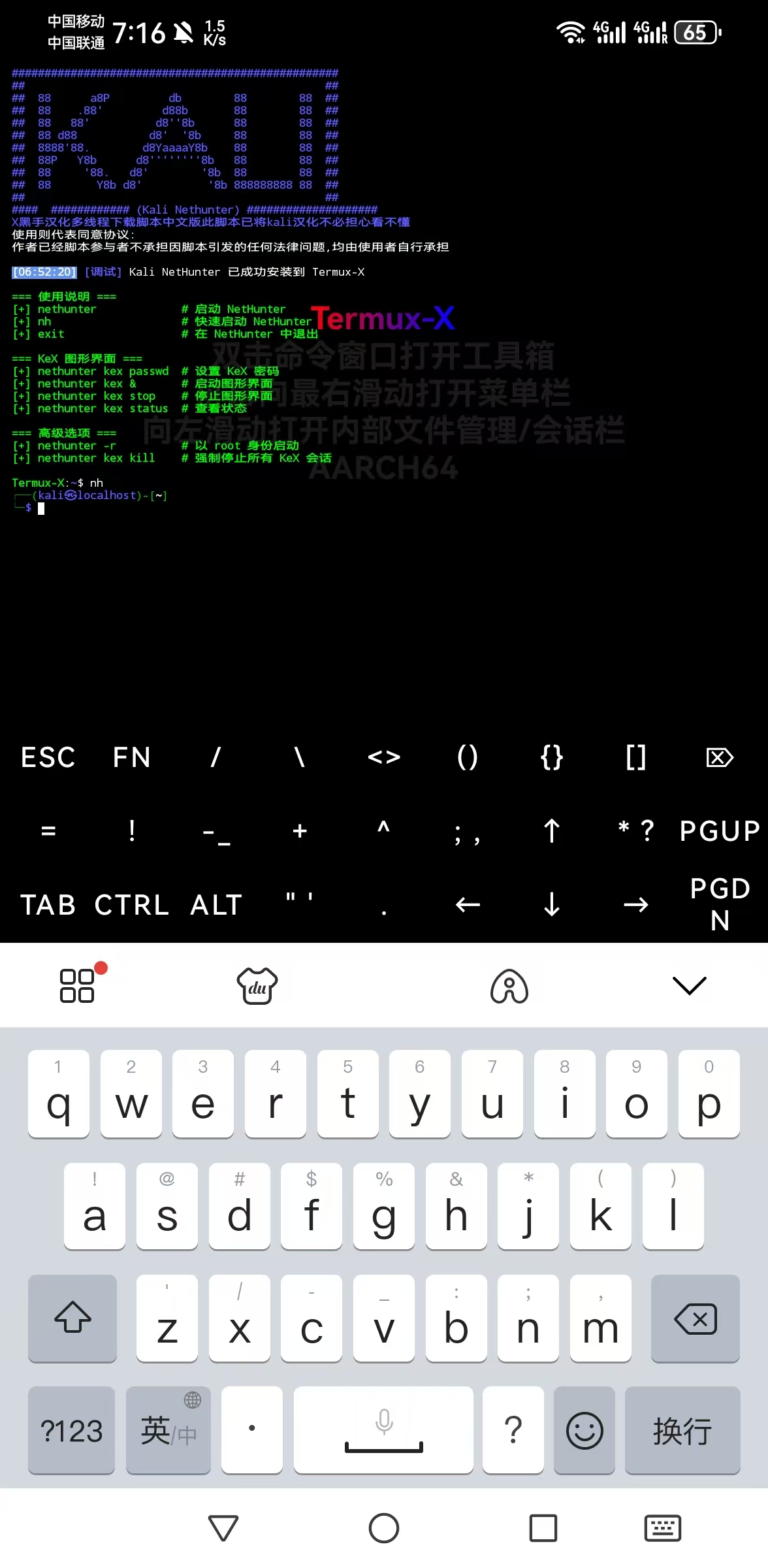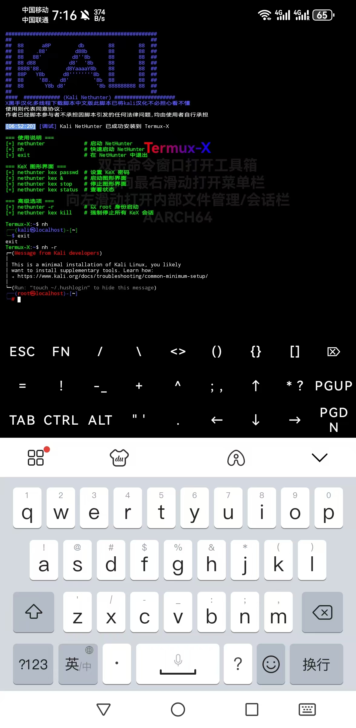 Kali NetHunter 已成功安装到 Termux-X提示时,表示安装完成。