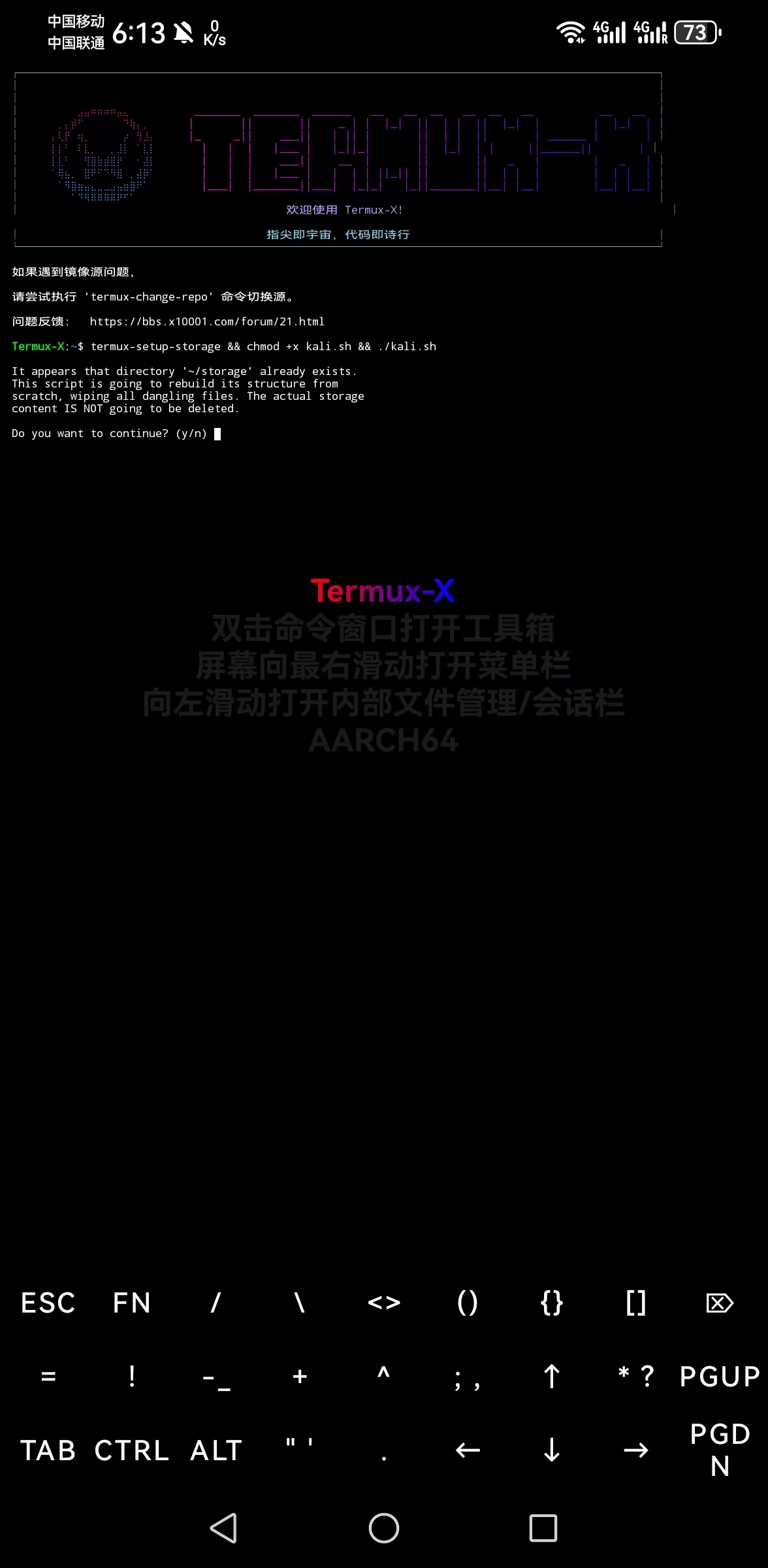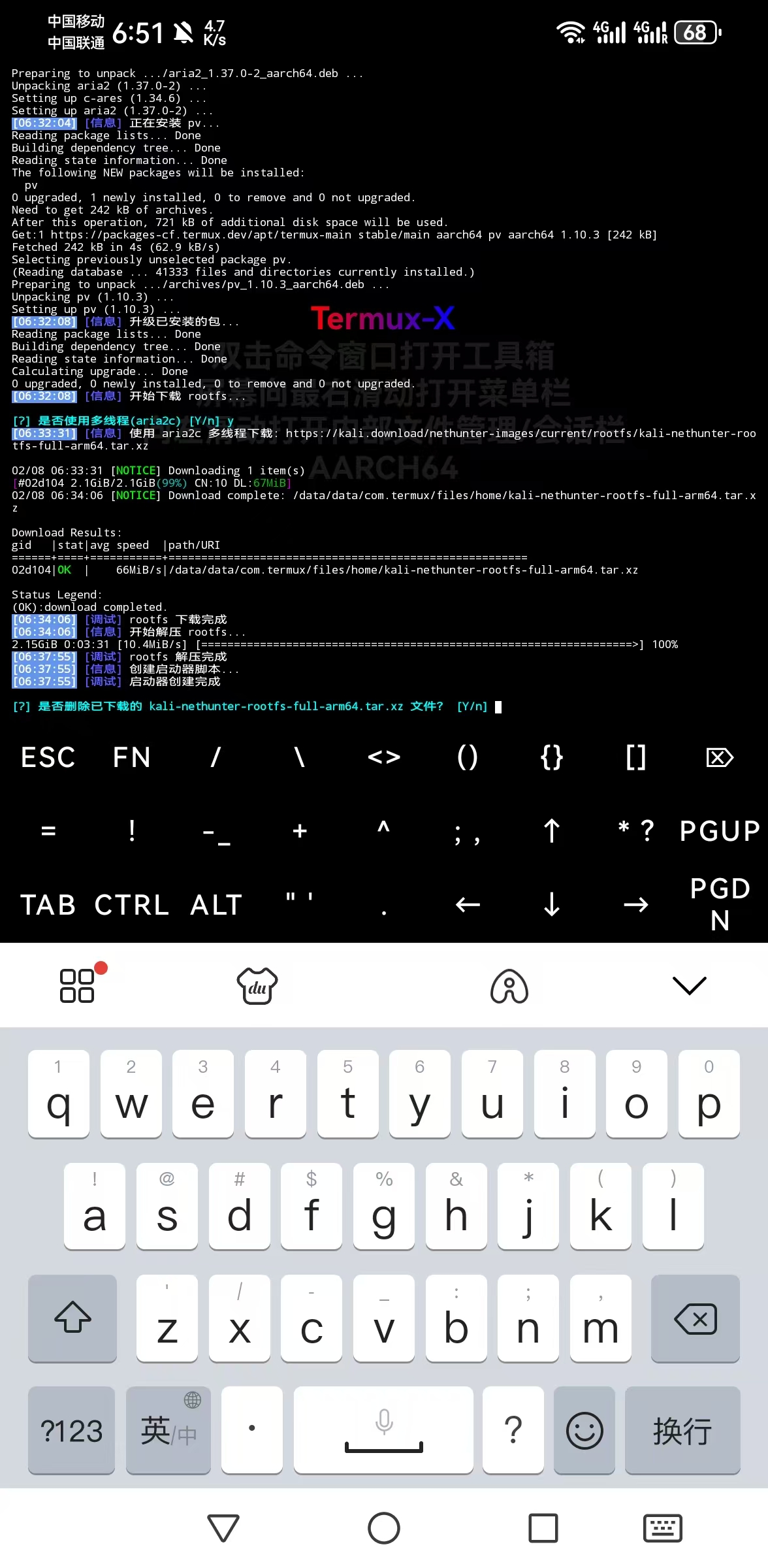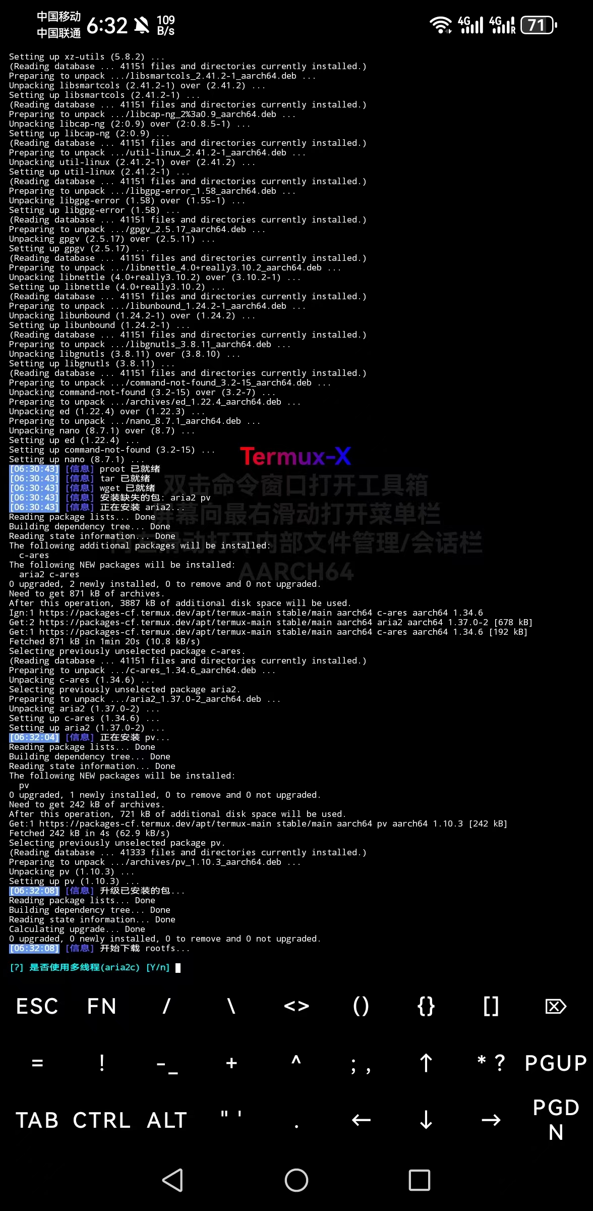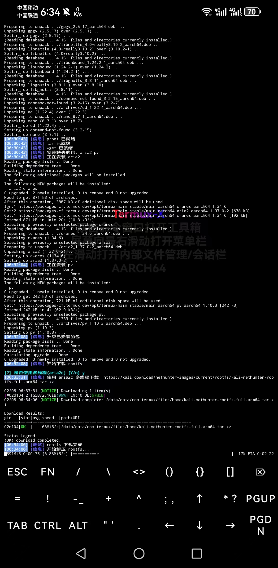 - 等待文件解压。解压时间取决于您的手机性能,请耐心等待,期间不要关闭 Termux-X。