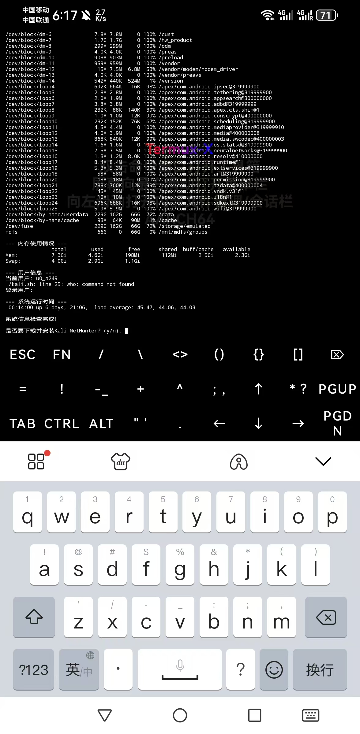 是否下载并安装Kali NetHunter? (y/n):时,输入 y 并回车确认。